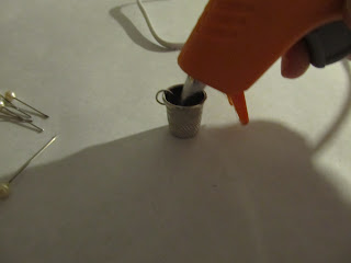 Add a little more glue to the top of the thimble around the pins (try not to get it onto the outside edge of the thimble) and add your thread. Wrap it around and between the pins making sure to get it stuck to the glue before it dries.